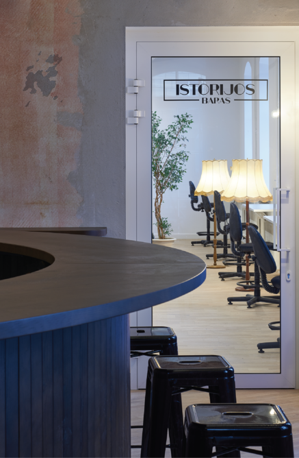 Today, when the lights on the ground floor are lit, the once tired building emerges from darkness and comes back to life. The coworking spaces located here and accessible from Pylimo Street, are separated from the main living area by the building‘s majestic entrance hall, whose heavy, dark fabric curtains draped down on the granite floor emphasise and draw attention to the height of the space.