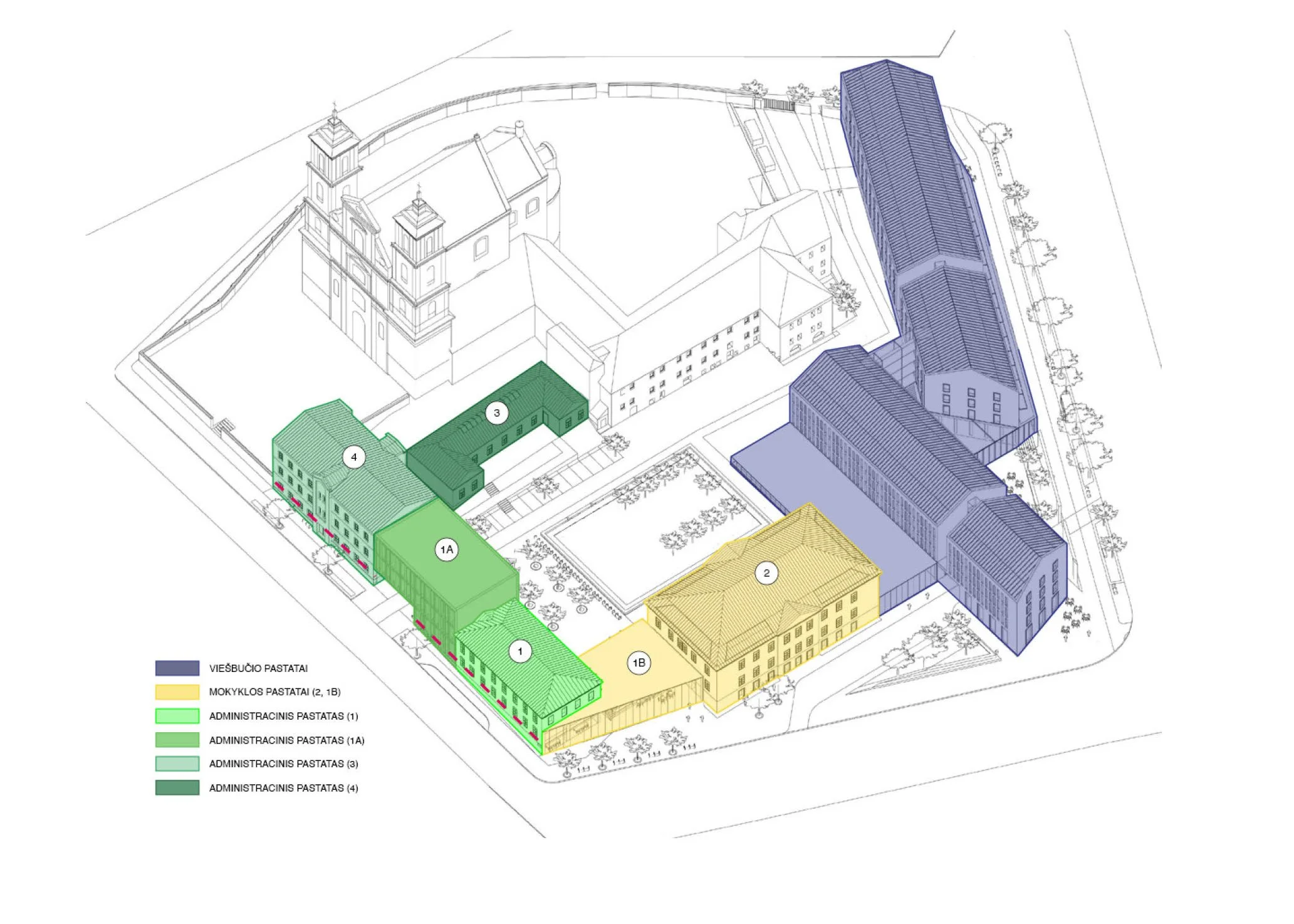 Kvartalas susideda iš keturių dalių: bažnyčios ir jos įėjimo erdvės, vienuolyno pastato su prieigomis, viešbučio pastatų su vidiniu kiemeliu ir licėjaus pastatų su viešu sodu. Bažnyčios ir vienuolyno sklype neprojektuojama.