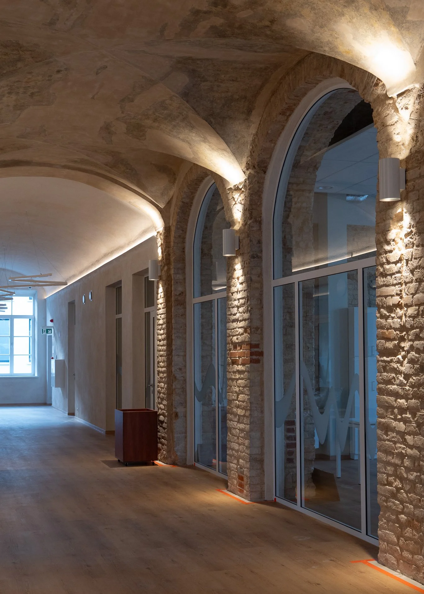 Atliekant istorinio pastato rekonstrukciją, ardymo darbų metu buvo atrasta unikali, iki tol nematyta medinė stogo konstrukcija – lenktosios stogo sijos. Įvertinus jų istorinę ir architektūrinę vertę, nuspręsta jas integruoti į projektą. Autentiškos konstrukcijos buvo konservuotos ir sustiprintos naujomis metalinėmis sijomis bei stygomis, užtikrinant jų ilgaamžiškumą ir saugumą. Projekte numatyti stoglangiai įleidžia natūralią šviesą, kuri paryškina autentišką medienos faktūrą ir konstrukcijų geometriją. Atidengta stogo sistema tapo interjero dalimi – vizualiai atveria erdvę, suteikia jai charakterio ir išryškina pastato istorinį sluoksnį, darniai derantį su naujais architektūriniais sprendiniais.