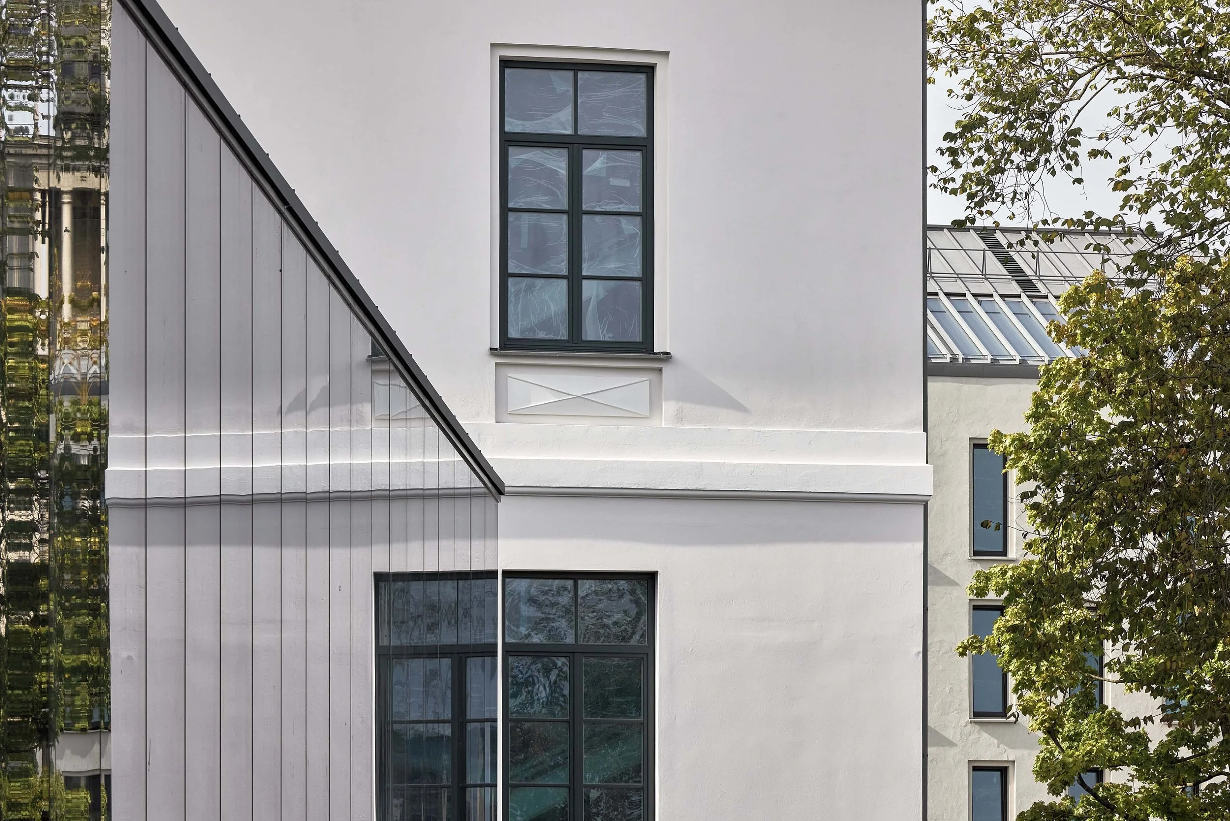 Architektūrinė koncepcija pirmenybę teikia gausiam natūralios šviesos patekimui. Dideli, restauruoti istorinės struktūros langai ir šiuolaikiniai stikliniai priestatai užtikrina, kad visos pagrindinės erdvės – klasės, biurai, viešbučio kambariai – gautų dienos šviesos ir turėtų išorinius vaizdus. Ypač išsiskiria švietimo patalpos, papildytos stoglangiais ir visiškai stikline amfiteatro sale, kuriančia šviesią, įkvepiančią atmosferą, palankią mokymuisi ir bendravimui. Išskirtinė inovacija slypi palėpės aukšto apšvietimo sprendime, sukurtame laikantis griežtų paveldo apsaugos gairių. Po išsamių konsultacijų su kultūros paveldo institucijomis projektuotojų komanda pristatė žemo profilio, į stogo plokštumą įleistus stoglangius, subtiliai įsiliejančius į stogo siluetą. Šis sprendimas tapo precedentu darbams saugomose teritorijose. Bendradarbiaujant su UNESCO paveldo ekspertais buvo sukurta speciali stoglangių sistema, pakeitusi tradicinius stoglangius-bokštelius. Šios vientisos plokščios stiklo plokštės, subtiliai tonuotos taip, kad derėtų prie esamos stogo dangos, įleidžia gausybę dienos šviesos, kartu išsaugodamos istorinės stogo linijos siluetą. Šis išradingas sprendinys sėkmingai suderina funkcinio apšvietimo poreikį su paveldo išsaugojimo reikalavimais, nustatydamas naują standartą panašiuose kontekstuose.
