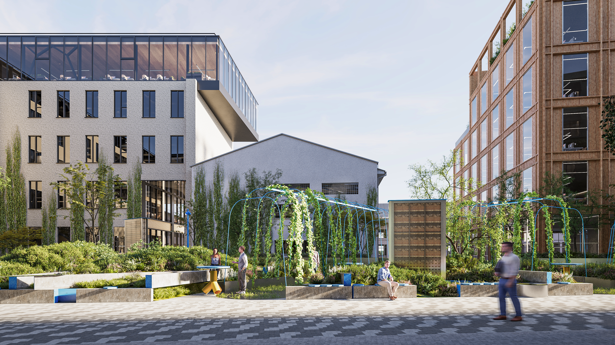 Human scaled pedestrian street with typical elements of small architecture (benches, small street lights) is being created. Lush green inner courtyards with cafes and wooden terraces on the first floors are also created to keep the area lively in the evenings and mornings and to attract people passing by. The trees growing in the area are preserved as much as possible and supplemented with new evergreen plantings, thus creating year-round shrubbery masses.